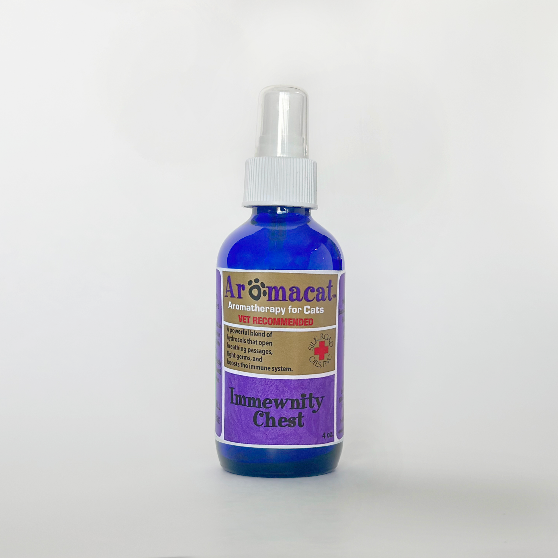 Hydrosols of Eucalyptus, Melissa and Lavender open up breathing passages and stimulate the immune system. A valuable blend for the wheezing cat or just the general well being of your feline as it grounds and purifies the air in their environment.